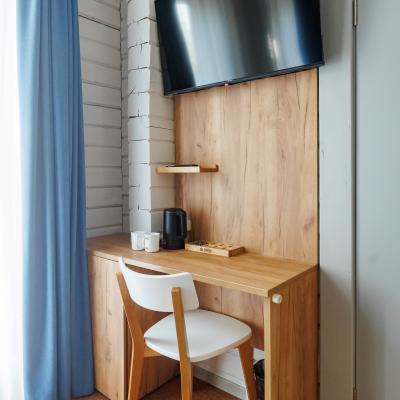 Мебель и внутренняя отделка помещений выполнены из натурального ясеня. В дизайне интерьеров современные материалы и технологии соединяются с аутентичными вещами. В элементы декора вплетаются мелодии старинной вышивки и магические линии славянских узоров-оберегов. Оригинальные светильники и текстиль наколдовывают уют и особую атмосферу гармонии.